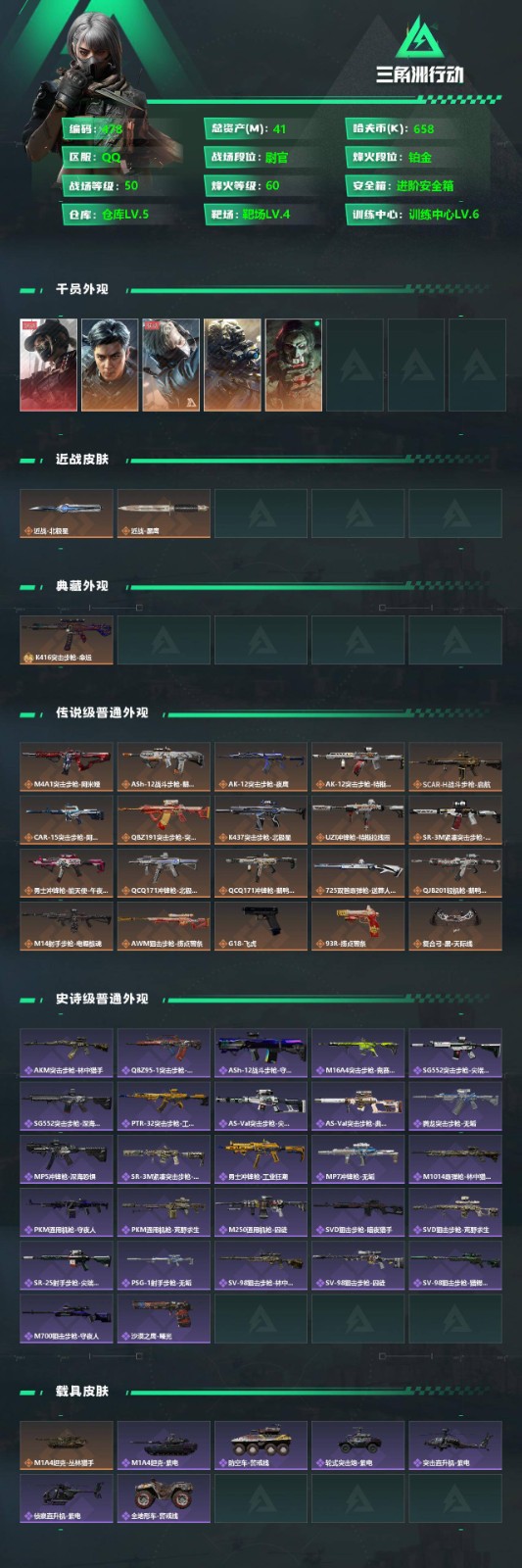 总资产209.4M 5干员外观 1近战 26传说枪械 烽火:铂金 战场:上等兵