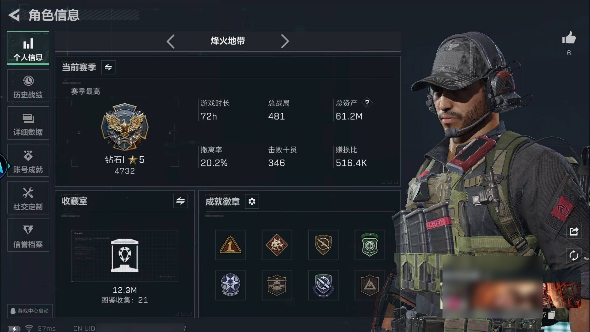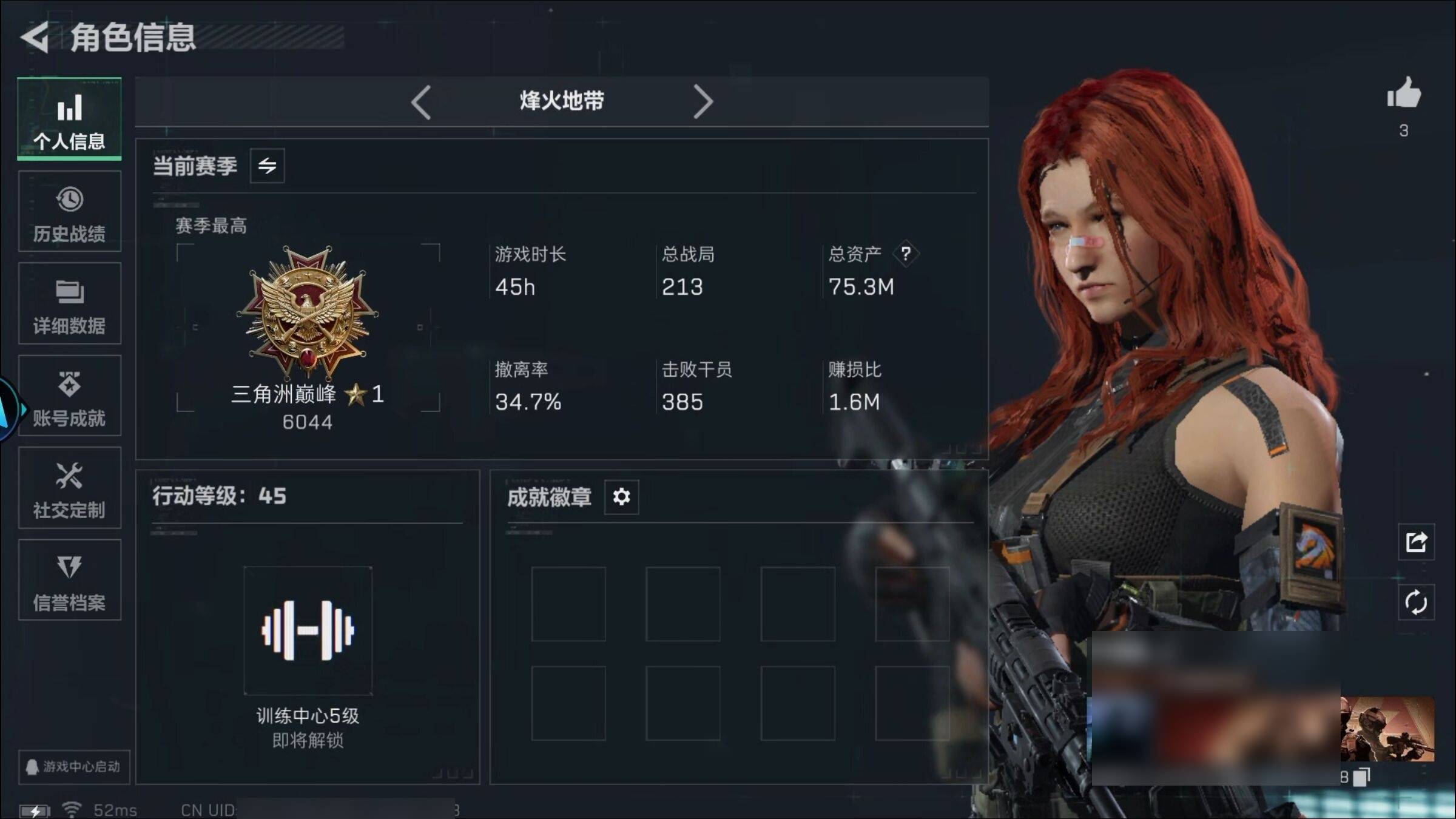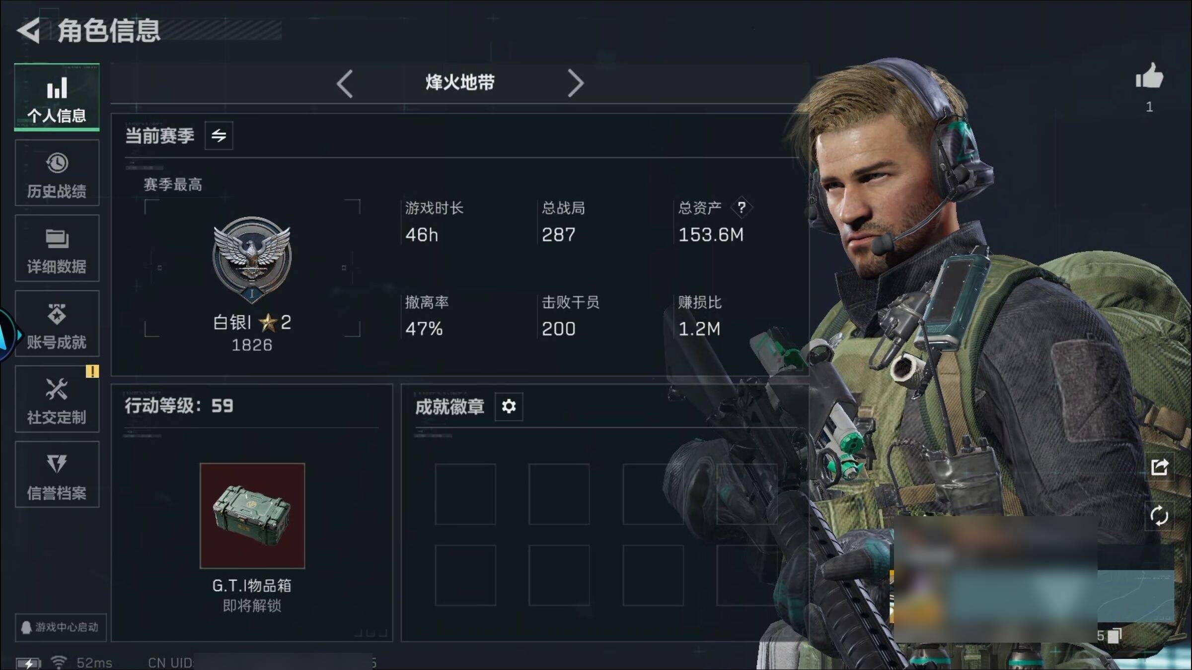 总资产105.2M 4干员外观 16传说枪械 烽火:黄金 战场:无军衔...¥1000.00